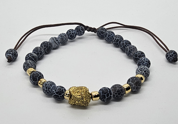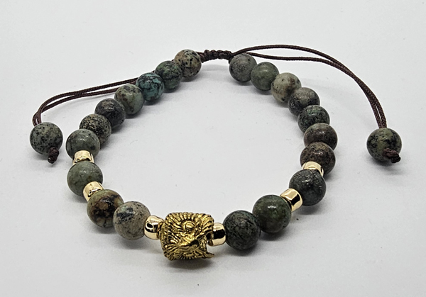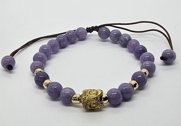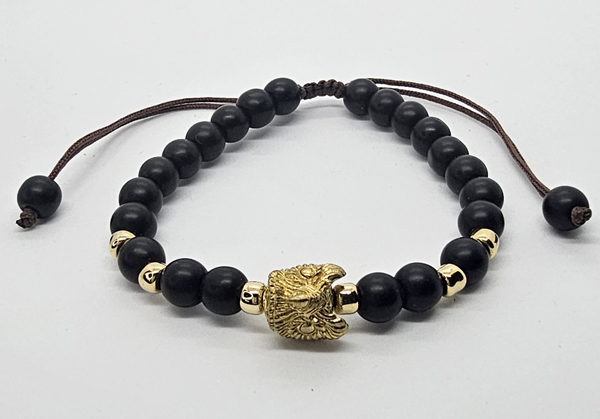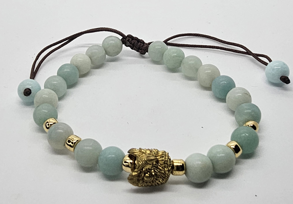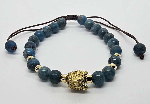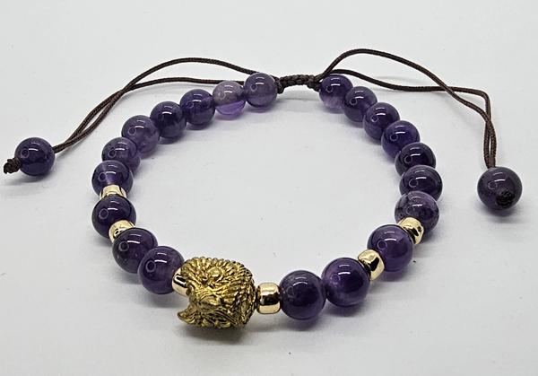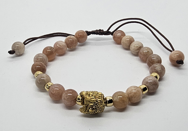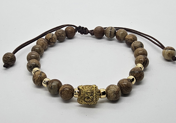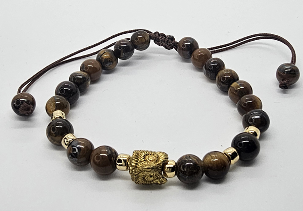 BRACCIALE CON PIETRE 6 MM CON GUFO IN OTTONE E PERLINE GIAPPONESI GOLD PLATED, CHIUSURA REGOLABILE A MACRAME MISURA DONNA