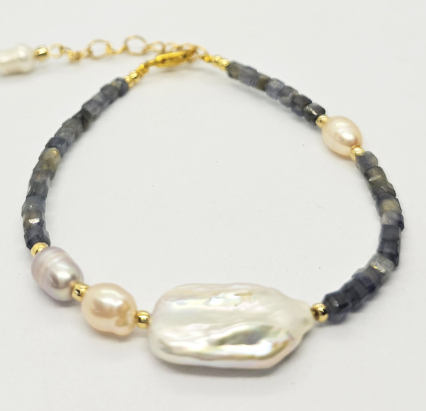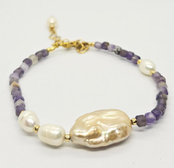 BRACCIALE CON PIETRE DURE E PERLE DI FIUME BAROK, PERLINE GIAPPONESI GOLD PLATED, CHIUSURA A CATENELLA REGOLABILE – STONE CUBIK SHAPE
