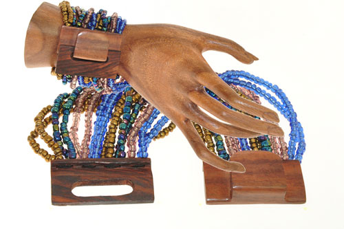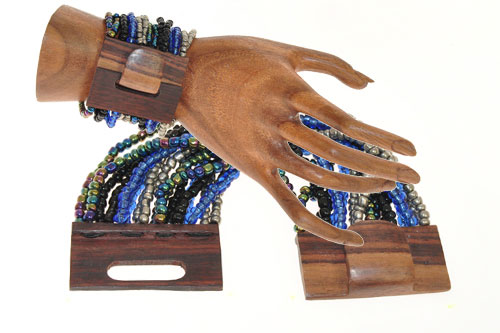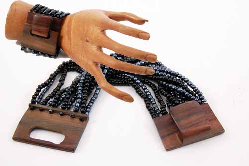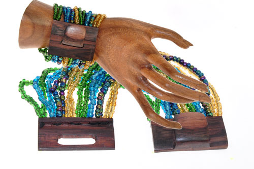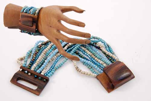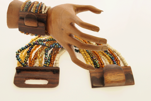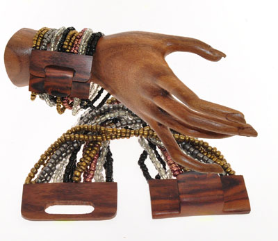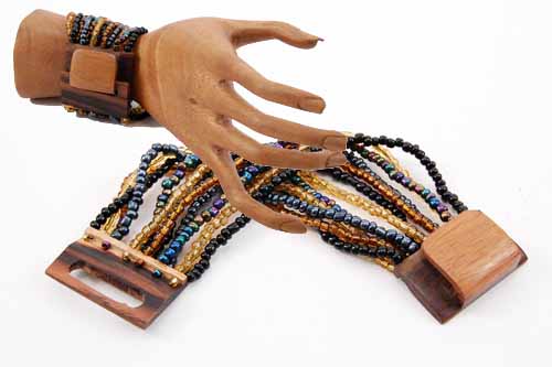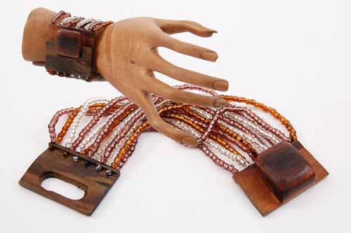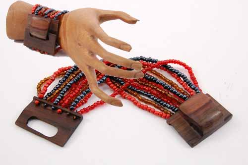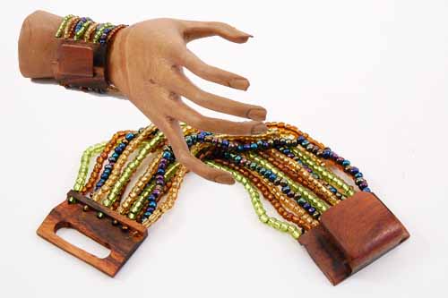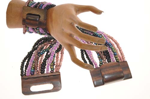 BRACCIALI ELASTICI PERLINE STRIPE E FIBBIA IN LEGNO
