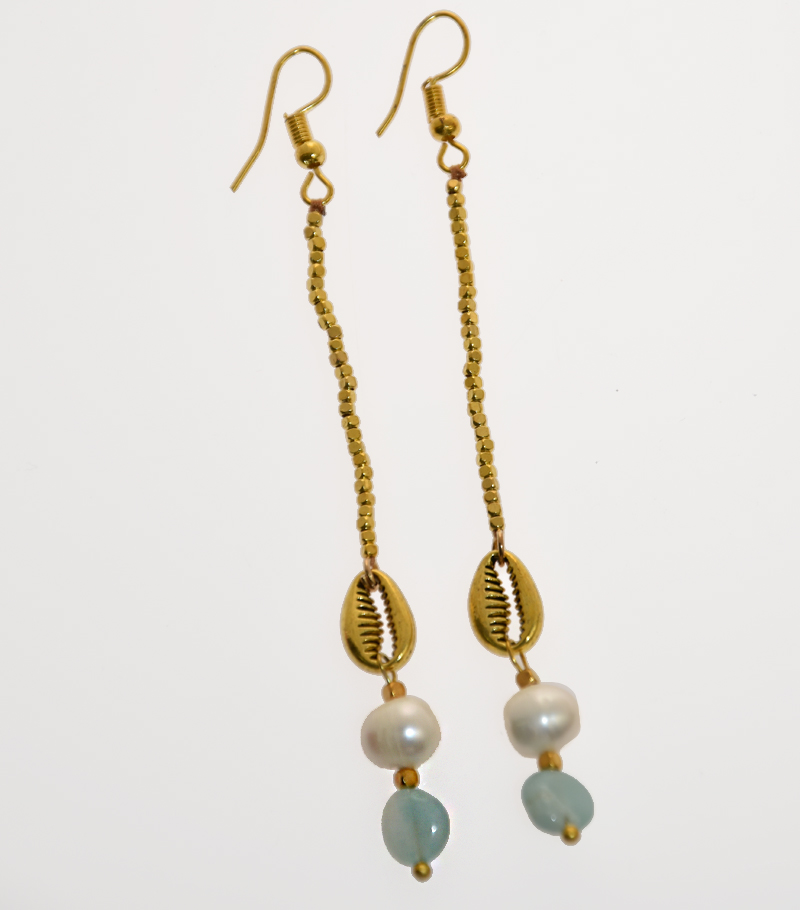 ORECCHINI CON PIETRE DURE E PERLE DI FIUME IN METALLO GOLD PLATED A CATENELA LUNGA CON PENDENTE CONCHIGLIA CAORI